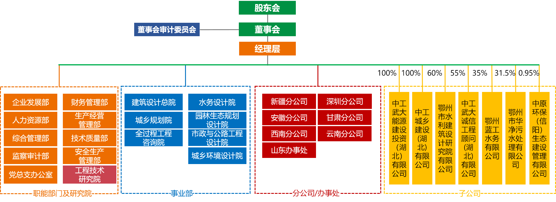 中工武大设计集团有限公司(以下简称“中工武大”)是由原武汉大学设计研究总院整体改制设立的国有高新技术企业,是国内勘察设计资质最为齐全的综合性勘察设计机构之一。 中工武大是以城乡建设、水利水电、能源电力三大领域为主业,为工程建设多行业全过程提供技术服务的科技型企业。持有国家各类工程建设测绘、勘察、咨询、设计、施工、监理等甲乙级资质50余项,可为客户提供工程建设项目科学研究、规划/策划、投融资、勘测设计、项目管理/项目监理、全过程咨询、施工总承包、生产运营等全过程服务。 中工武大总部位于武汉,在新疆、安徽、广东、海南、江西、江苏、四川、云南等地设立了分支机构。拥有860多名专业技术人才,各类注册工程师约300人次,并建立了完善的项目总承包管理体系,以及覆盖所有业务范围的质量、环境和职业健康安全管理体系。 自成立二十多年来,凭借过硬的服务质量,中工武大为国内外数千个项目提供了策划、咨询、设计、工程总承包及项目管理、全过程咨询服务,在节水灌溉、生态环境工程、医疗建筑工程、教育建筑工程、园林景观工程、工程总承包等特色业务领域取得显著业绩,荣获省部级以上优秀工程勘察设计奖百余项。 公司始终坚持以国家需求为导向,大力推动技术创新、科研成果转化,发挥企业专业技术力量。依托院士专家工作站,成立了湖北省工程技术研究中心、武汉市企业研究开发中心,获得知识产权300余项,参与国家及行业标准编制30余项,相关技术成果已在国内多个省份成功推广落地,获得业界一致认可。 传承百年名校智慧,彰显中国工程价值。中工武大始终秉持“诚信、执着、创新、务实”的企业文化,以成为客户首选的工程建设服务商为愿景,打造国内一流的工程设计咨询集团。 公司各事业部简介 城乡规划院 城乡规划院业务涵盖国土空间规划、控制性详细规划、修建性详细规划、历史文化名城名镇名村保护规划、城市设计、产业园区规划、生态环境保护规划、流域综合治理规划、红色文化资源规划设计等类型,近年来获得国家及省部级规划类奖项30余项。 除完成各类传统法定规划外,城乡规划院还探索了城市有机更新策略、以全域国土综合整治为抓手、产业规划为核心的乡村振兴之路、生态保护的价值实现路径、双碳战略下的未来融合园区、闲置资产综合利用等顶层规划。以大数据为基础,协同武汉大学的学科和人才优势,依托山东高速集团投资及建设背景,提供投、建、营一体化的创新性综合策划思路,为政府解决当代城乡发展的重难点问题。 建筑设计总院 建筑设计总院始终专注“业务、团队、技术、科研”四位一体布局,坚持做结构复杂超高层建筑的实践者;做绿色医院和健康城市的倡导者;做教育建筑领域的空间营造者;做BIM、装配式建筑、绿色建筑等新兴领域前沿技术的探索者。能够为建设工程项目提供前期策划、咨询设计、工程总承包及全过程咨询等全方位服务。已累计完成两千余项大、中型设计项目和咨询服务项目,业务遍及海内外。 水务设计院 水务设计院深耕于传统水利水电工程、水环境与水生态修复等领域,致力为国家、企业提供项目策划、工程咨询、勘测设计,以及PPP、EPC工程总承包全过程服务。 在传统水利水电工程领域,水务设计院积累了丰富的设计和项目管理经验。其中,在筑坝技术、高扬程扬水泵站、远距离输水等领域具有行业领先优势;在水环境与水生态修复领域,建立了水质检测实验室和科研试验基地,拥有多项专有技术,制订了《水环境与水生态修复企业标准》,参与行业标准制订3项。累计完成水资源利用、水库枢纽、灌溉排涝、河道治理、城市防洪、引调水、围垦工程、水环境与水生态修复等类型项目千余项。 园林生态规划设计院 园林生态规划设计院始终秉持景观与自然共融、功能与美感共存的创新设计理念,致力为政府、企业提供可持续、高价值的综合解决方案。近年来,园林生态规划设计院紧跟国家政策导向,业务涵盖城市绿地、城市公园、专类公园以及风景名胜区、度假区、旅游区规划设计、生态修复与环境治理等领域,尤其在生态景观、涉水景观、矿山生态修复等方面实践经验丰富,累计完成数百项具有社会影响的工程项目并多次获奖。 市政与公路工程设计院 市政与公路工程设计院拥有给排水、道路、桥梁、电气、交通、造价等领域经验丰富的技术专家团队,可承接给排水、市政道路、桥隧、公路等类型的工程咨询、设计和EPC工程总承包项目。多年来,参与完成大批市政精品工程,以优质的产品质量和良好的服务态度,赢得各方业主的高度评价。 全过程工程咨询院 中工武大设计集团有限公司全过程工程咨询院(以下简称“全咨院”)以高效推进项目全生命周期管理为使命,充分依托集团资质体系与专业资源优势,凭借勘察设计、项目管理、工程总承包领域的三重业务积淀,构建起“一站式”工程解决方案服务体系。 作为集团全咨业务核心执行部门,全咨院以复合型人才矩阵为支撑,打造了一支精技术、善管理、通流程、懂商务的高素质专业团队。团队既能以“业主视角”统筹项目顶层设计,精准把握业主核心需求,又能凭借丰富施工组织经验协调各参建方,更可延伸至运营维护咨询的全寿命周期管理,提供从可行